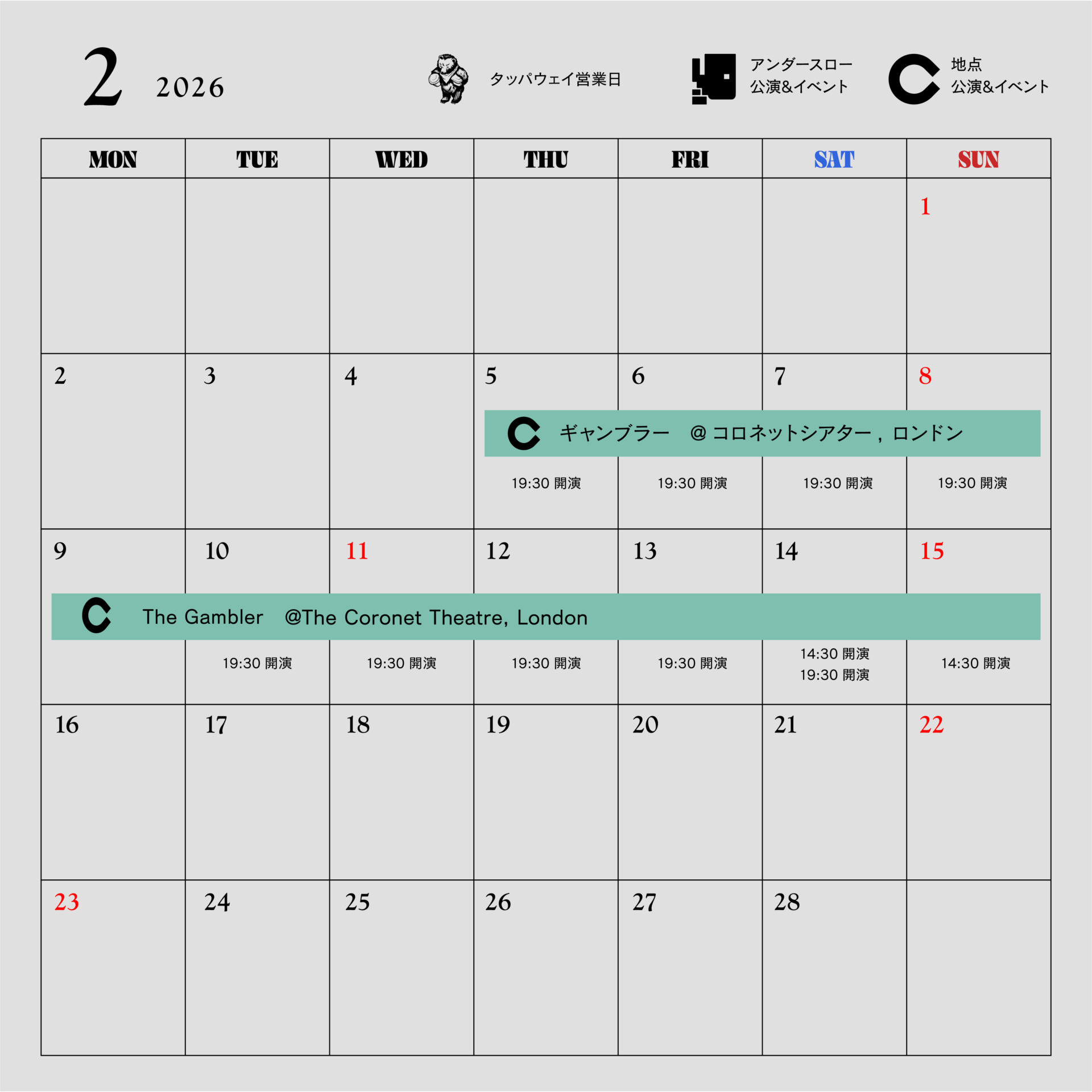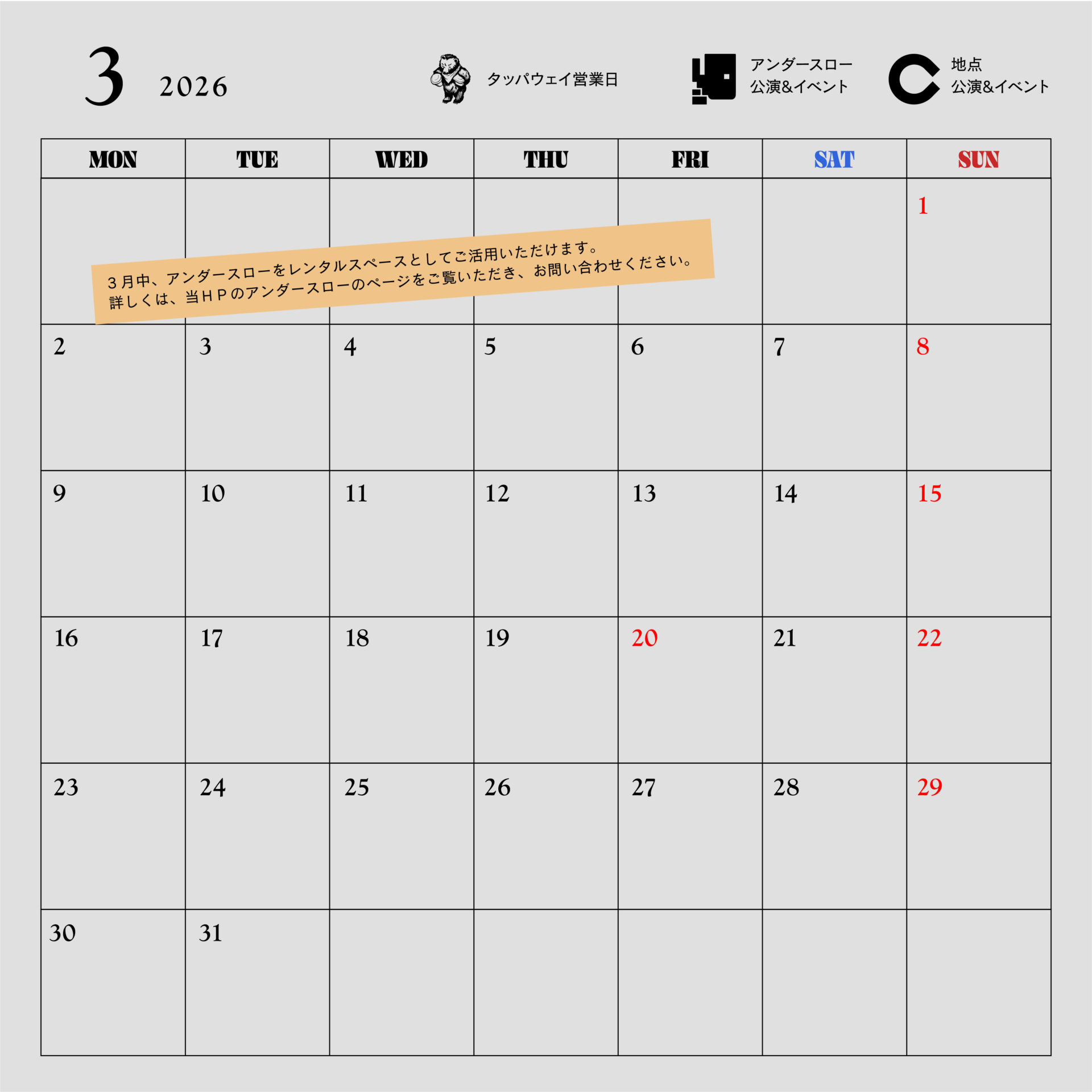 地点・アンダースロー・タッパウェイの予定が確認できます。
